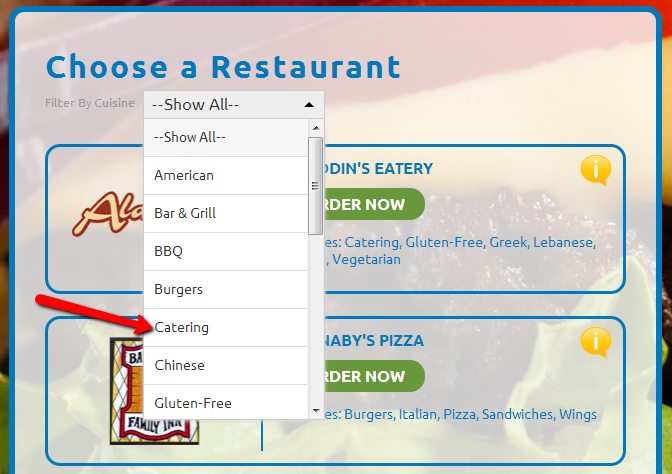 Catering has never been so EASY and so FAST! To view the restaurants that offer catering, click on the "Browse Menus" link at the top of the page, then select "Catering" in the "Filter By Cuisine" drop down. Most catering options can be delivered within an hour of placing your order.